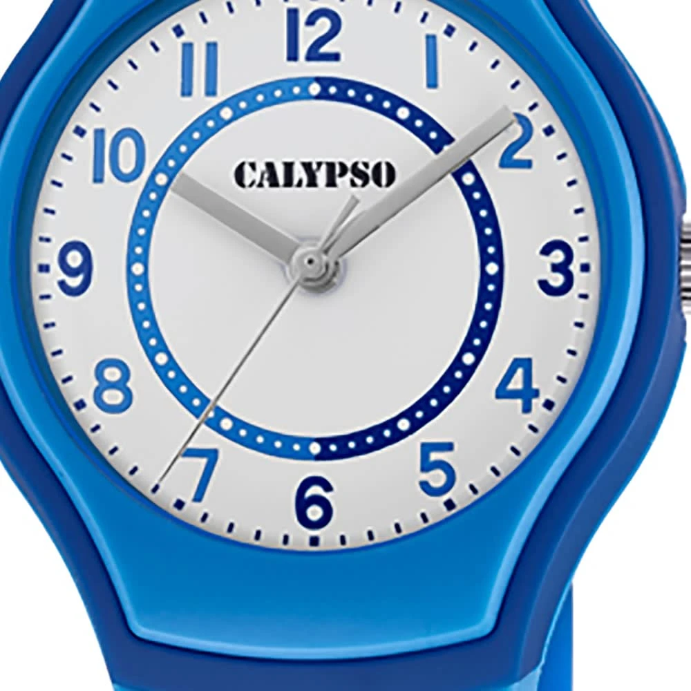 Calypso Junior Kollektion Armbanduhr:Die Quarzuhr der Marke Calypso hat ein schönes Armband aus Kunststoff in blau mit Dornschließe. Die Jugenduhr aus der Calypso Junior Kollektion hat ein Zifferblatt in der Farbe weiß gepaart mit einer Kunststoffglas-Abdeckung. Die Form der modischen Uhr ist rund und das Gehäuse ist mittel ca. 31mm in der Farbe blau dunkelblau.