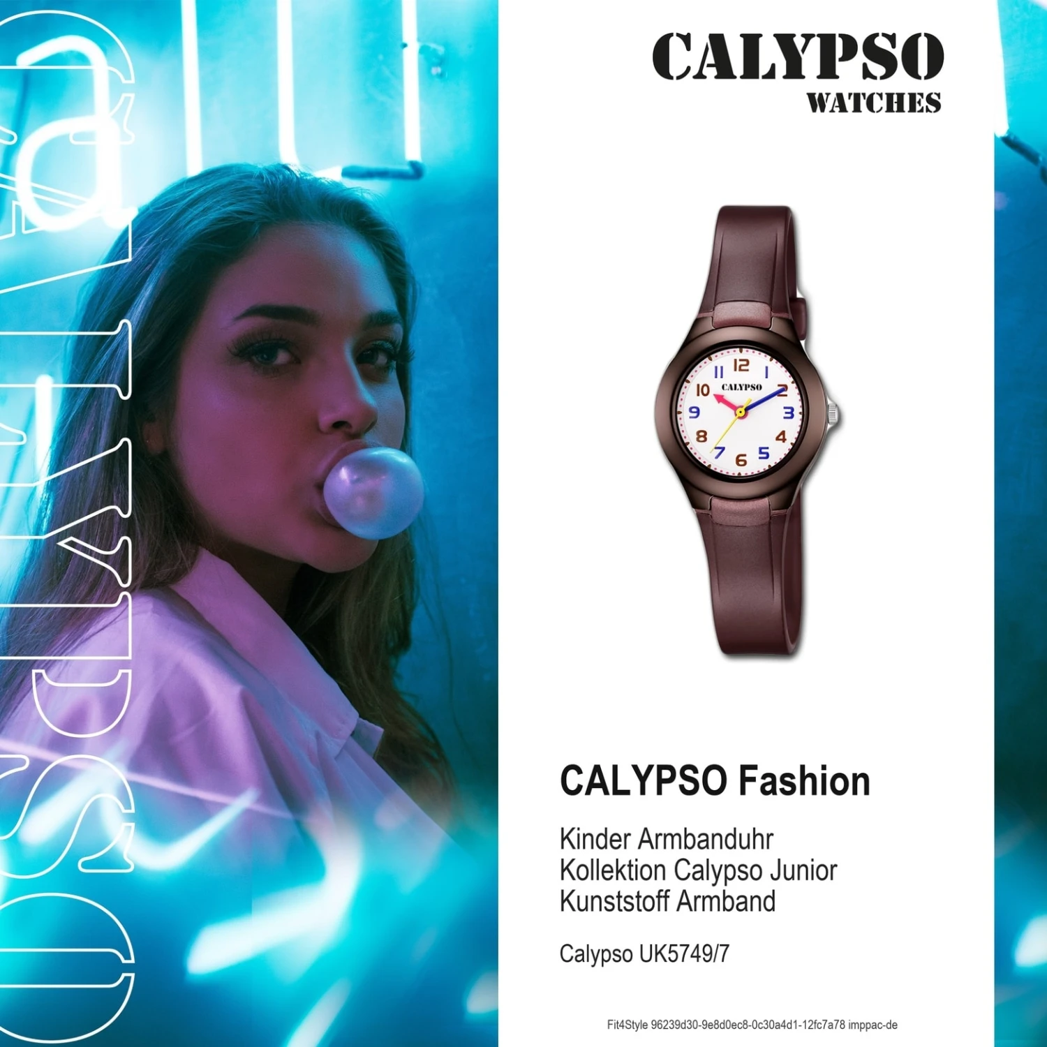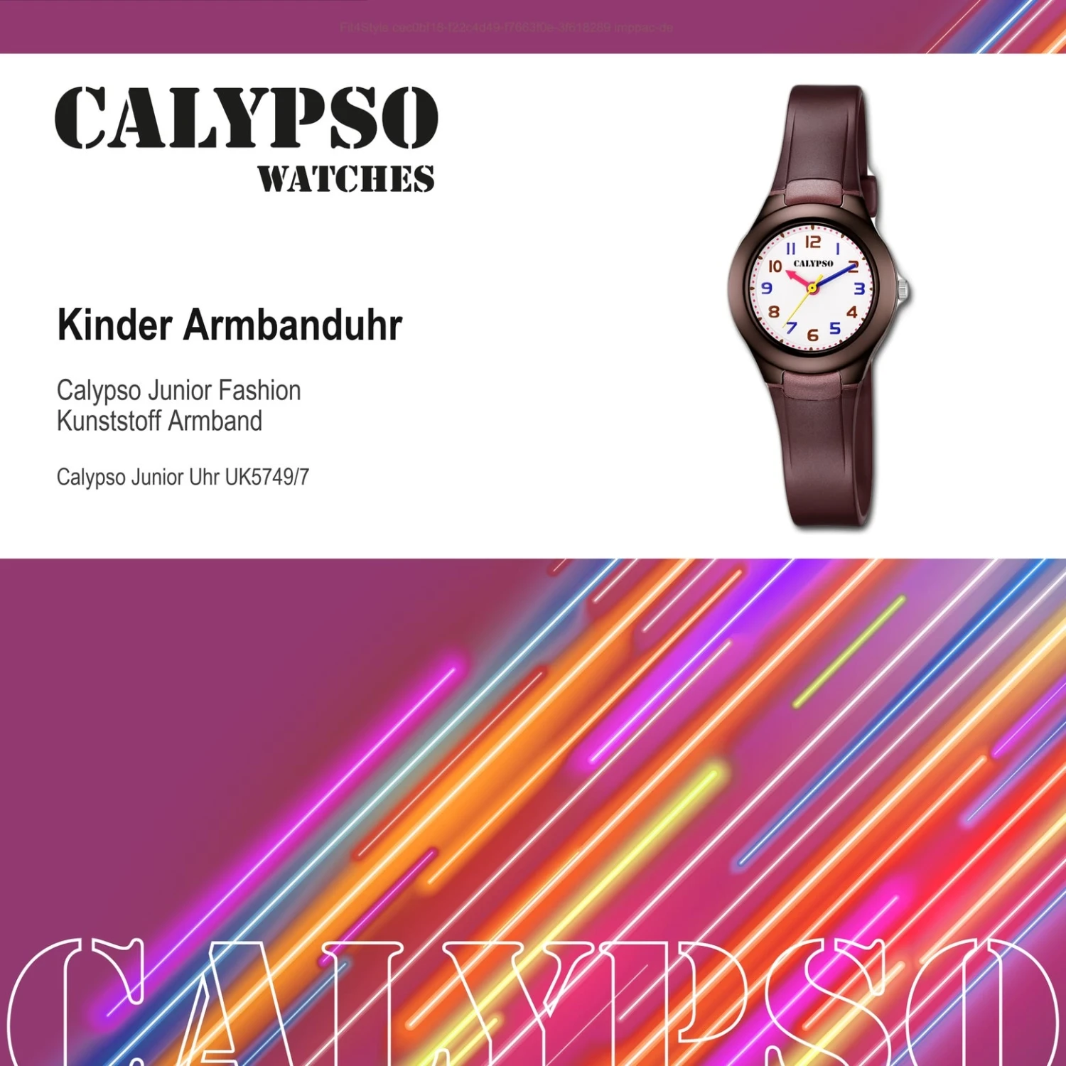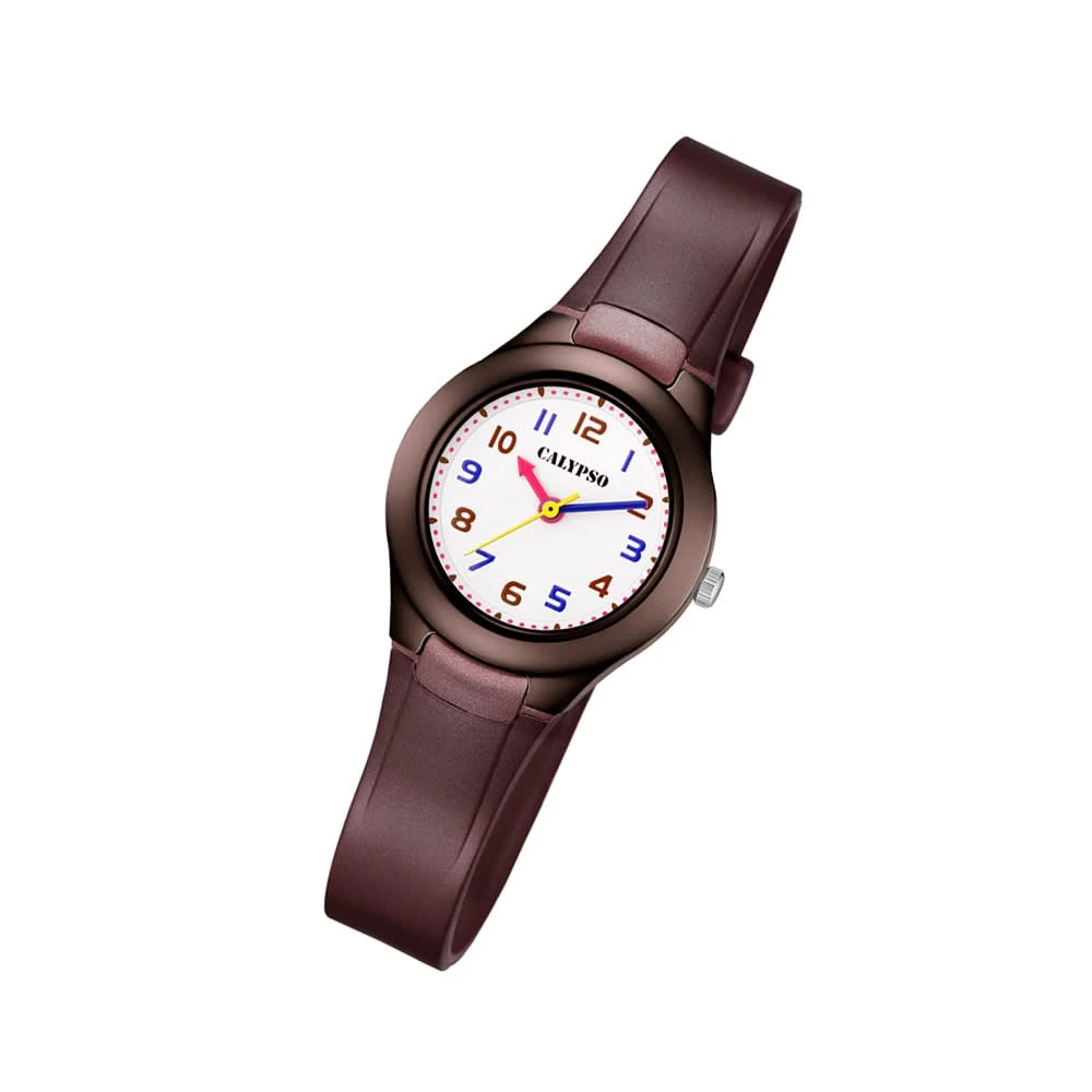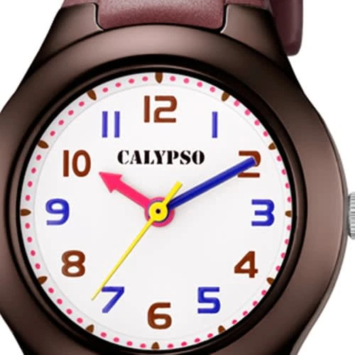 Calypso Junior Kollektion Armbanduhr:Die Quarzuhr der Marke Calypso hat ein schönes Armband aus Kunststoff PU in braun mit Dornschließe. Die Kinderuhr aus der Calypso Junior Kollektion ist Analog und hat ein Zifferblatt in der Farbe weiß gepaart mit einer Kunststoffglas-Abdeckung. Die Form der modischen Uhr ist rund und das Gehäuse ist klein ca. 27mm in der Farbe braun.
