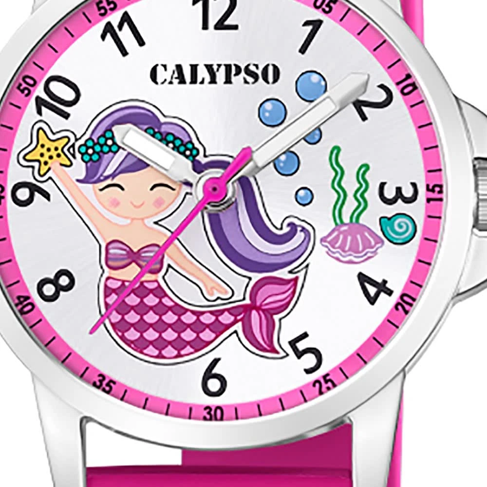 Calypso Junior Kollektion Armbanduhr:Die Quarzuhr der Marke Calypso hat ein schönes Armband aus Kunststoff in pink mit Dornschließe. Die Kinderuhr aus der Calypso Junior Kollektion hat ein Zifferblatt in der Farbe pink weiß gepaart mit einer Kunststoffglas-Abdeckung. Die Form der modischen Uhr ist rund und das Gehäuse ist klein ca. 27mm in der Farbe silber.