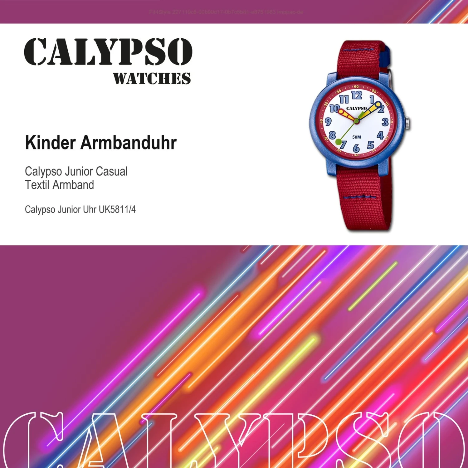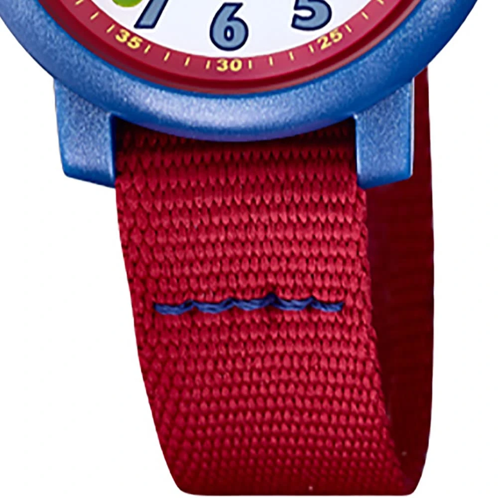 Calypso Junior Kollektion Armbanduhr:Die Quarzuhr der Marke Calypso hat ein schönes Armband aus Textil in rot mit Dornschließe. Die Kinderuhr aus der Calypso Junior Kollektion hat ein Zifferblatt in der Farbe weiß gepaart mit einer Kunststoffglas-Abdeckung. Die Form der modischen Uhr ist rund und das Gehäuse ist mittel ca. 32mm in der Farbe blau.