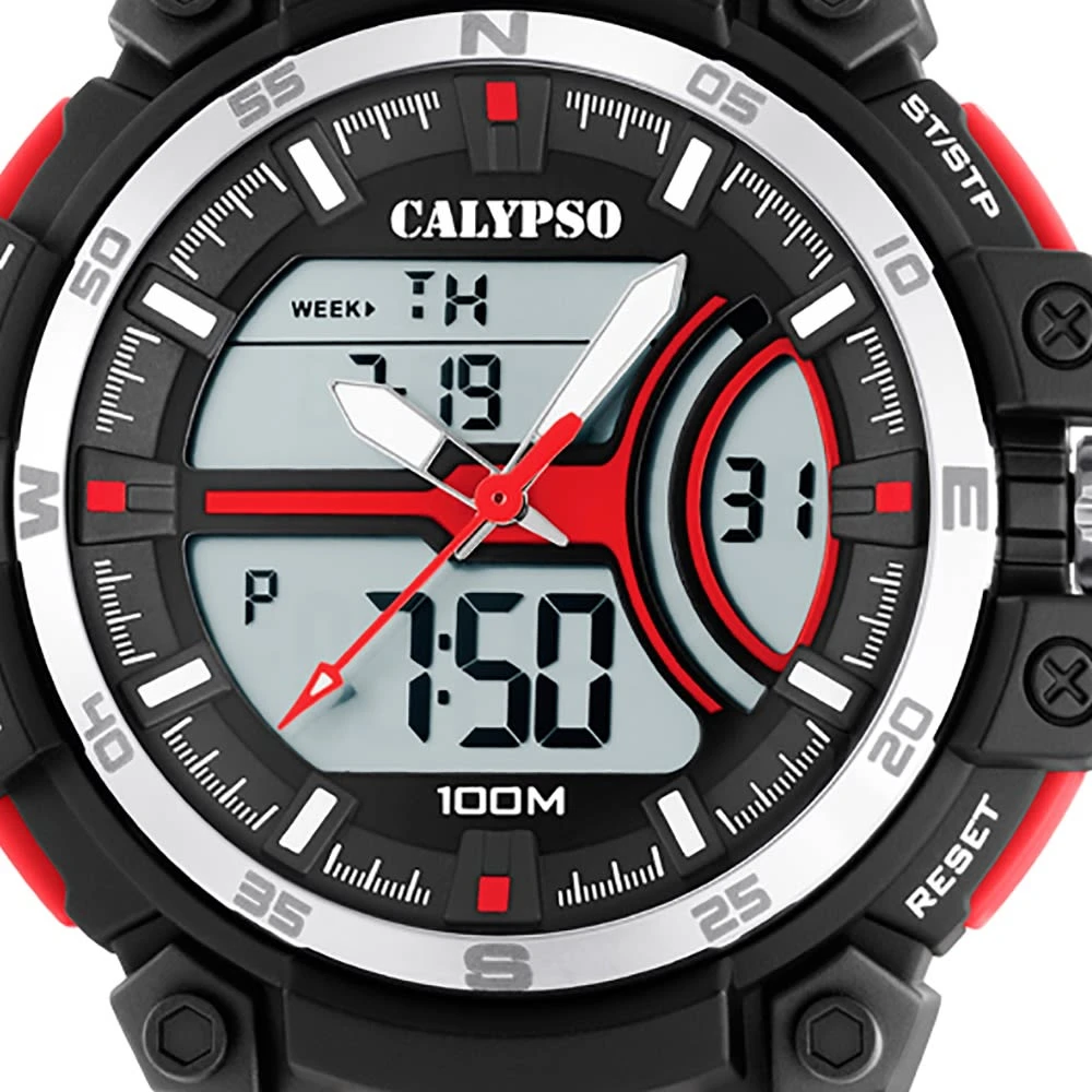 Calypso Digital Kollektion Armbanduhr:Die Quarzuhr der Marke Calypso hat ein schönes Armband aus Kunststoff in rot mit Dornschließe. Die Herren Jugenduhr aus der Calypso Digital Kollektion hat ein Zifferblatt in der Farbe schwarz gepaart mit einer Kunststoffglas-Abdeckung. Die Form der modischen Uhr ist rund und das Gehäuse ist extra groß ca. 51,5mm in der Farbe schwarz.