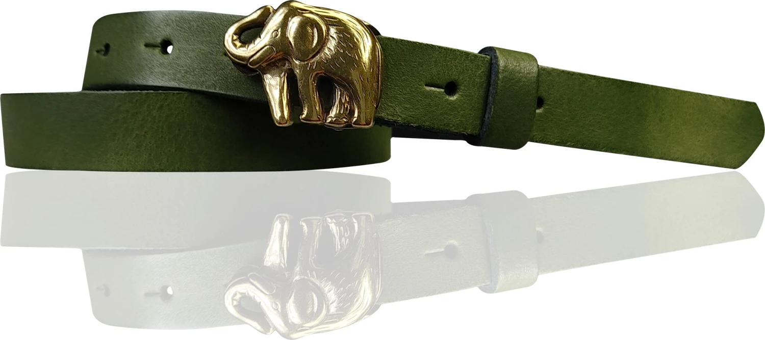 Edler Kindergürtel mit einer messingfarbenen Elefanten-Gürtelschnalle. Der schmale Gürtelriemen ist aus echtem Rindsleder und in vielen Farben erhältlich. Gürtelbreite: 2 cm