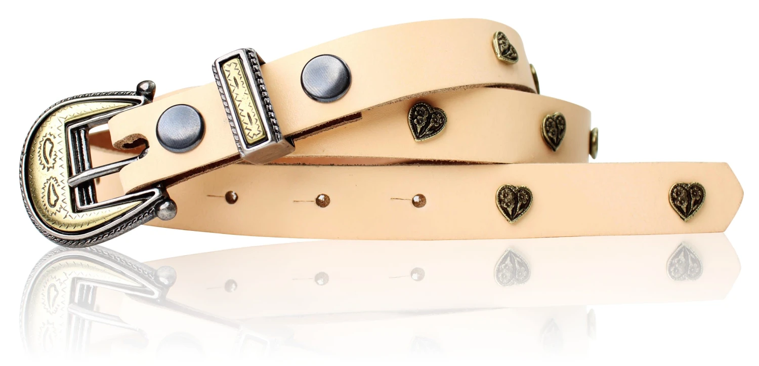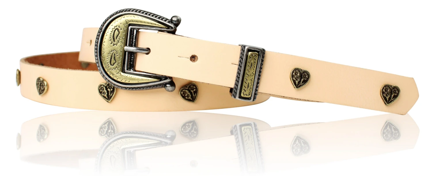 Niedlicher Kindergürtel mit kleinen Herznieten in Messing durchgehend besetzt. Eine hübsche Dornschnalle mit passender Schlaufe sorgt für den modischen Chic auch schon für kleine Ladies. In 3 tollen Farben erhältlich.