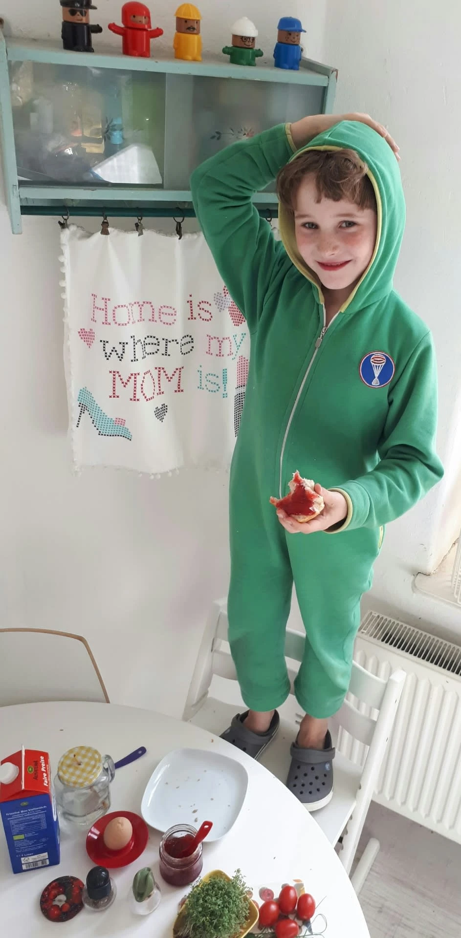 Praktischer Anzug aus Sweater-Material in Grashüpfergrün mit einem Zitronengelben Jerseyfutter. Die Kapuze und die Eingrifftaschen setzen sich farblich ab. Die Innenseite ist flauschig und warm. Der Overall ist für alle Altersklassen geeignet. Schnell mal mit den Eltern zum Bäcker, oder am Wochenende einfach ausgelassen spielen. Er spart enorm viel Platz in jeder Reisetasche. Für jede Eventualität schnell und passend angezogen. Immer gut für die kühlen Stunden an schönen Sommerabenden, oder am Meer.