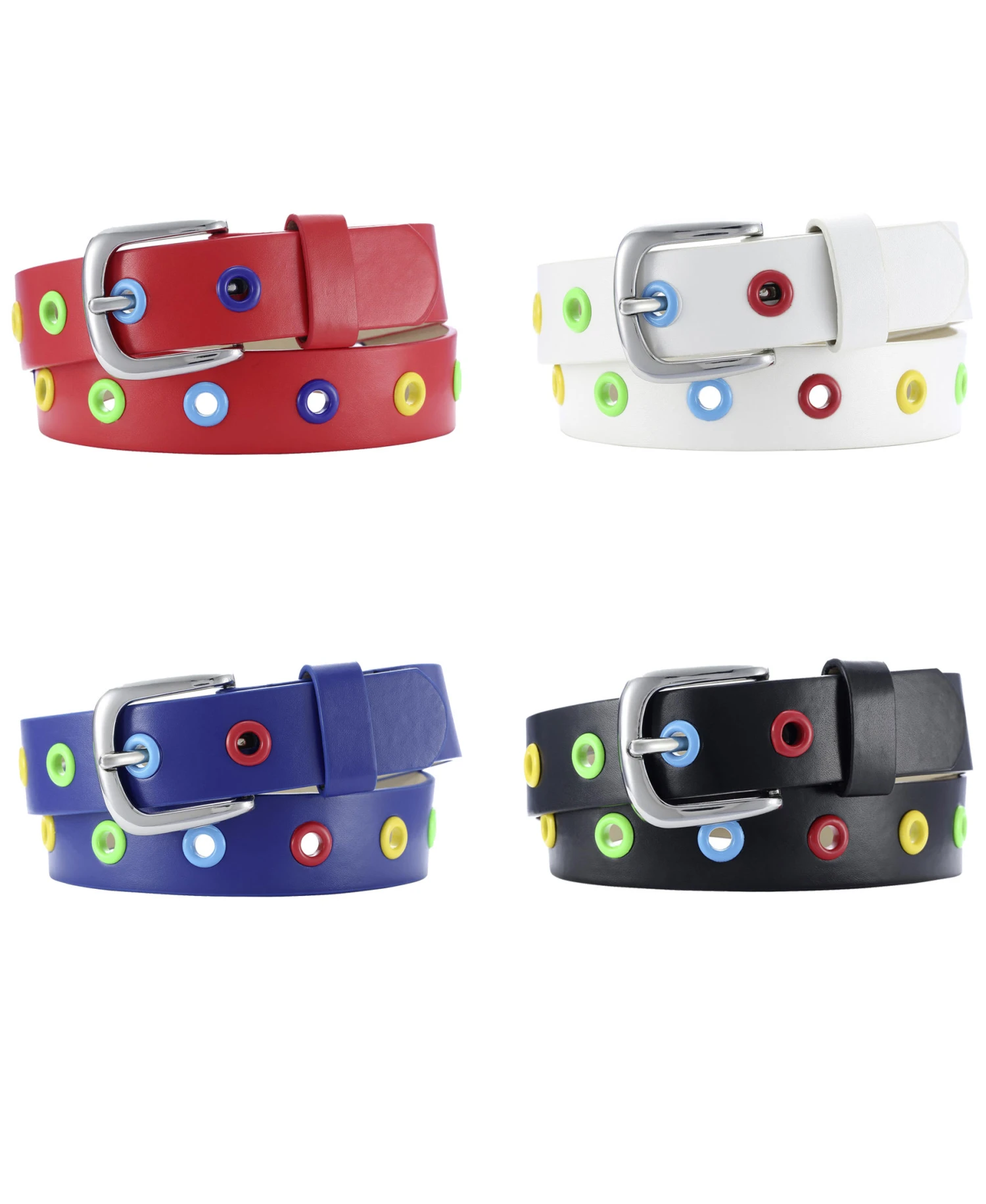 Stylischer Gürtel für Kinder mit bunten Kreisen als Gürtellöcher. Der Gürtel hat eine Metallschnalle mit Dornschließe. Der Gürtel hat eine Breite von ca. 25 mm. Erhältlich in den Größen 55, 60, 65, 70 und 75 cm.