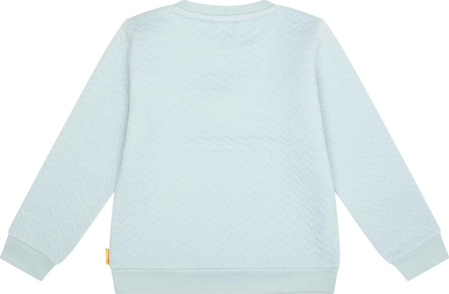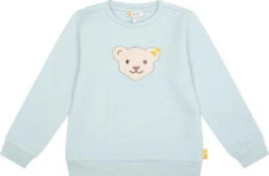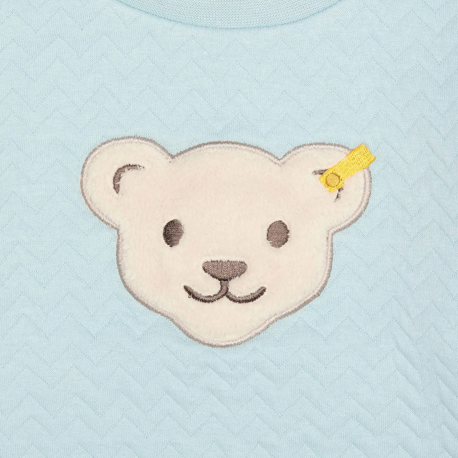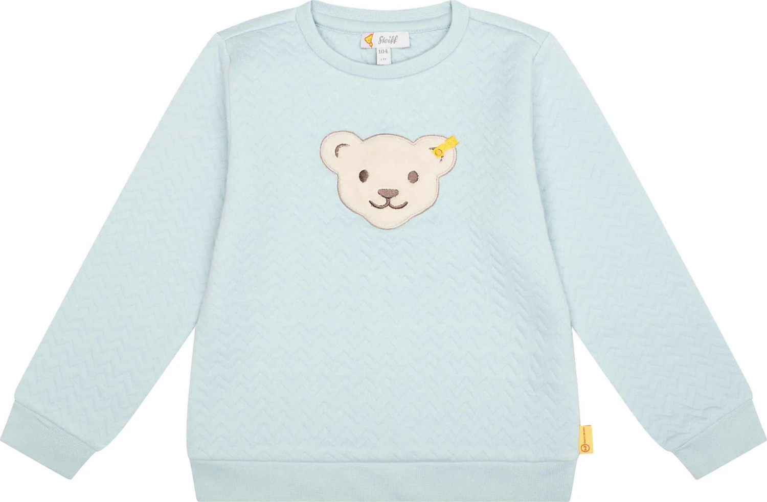 Mit einem sehr edlen Zick Zack-Look erobert dieses Sweatshirt die Herzen kleiner Stilikonen. Elastische Rippbündchen ermöglichen unkompliziertes Anziehen. Einfach schnell obendrüber gezogen oder als Basic für coole Alltags-Looks, die gesteppte Optik auf Hellblau lässt sich nach Lust und Laune als Hingucker kombinieren. Natürlich ist es nicht nur stylisch: wir haben uns bei diesem Artikel für einen weichen und wärmenden Sweat Stoff entschieden, damit Ihr Kind auch an kalten Tagen nicht friert. Für alle Fälle begleitet ein flauschiges Steiff Teddybärmotiv mit Quietsche auf der Shirtmitte Ihre Kleine zu Ausflügen und Abenteuern. Ein Lieblingsstück!