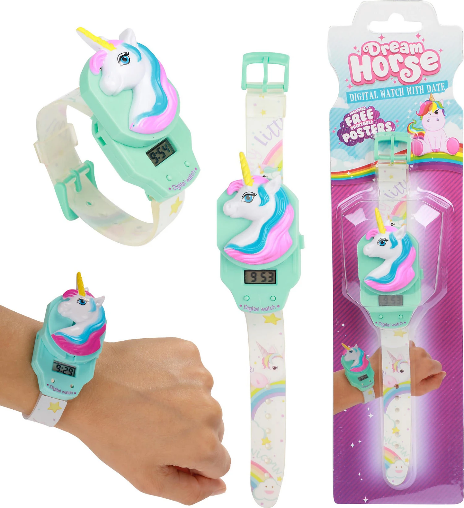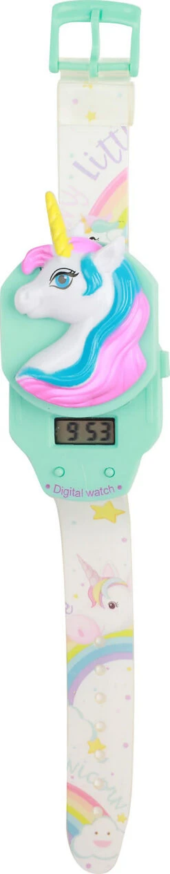 Die digitale Kinderarmbanduhr „Dream Horse Einhorn“ sieht auf den ersten Blick wie ein schickes Armband aus. Wenn das Einhorn nach oben geschoben wird, zeigt sich, dass darunter eine echte Digitaluhr steckt.